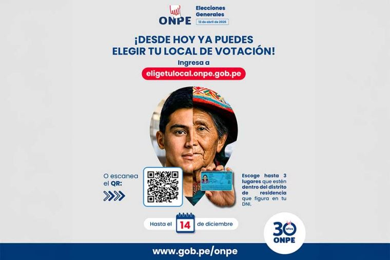 La Oficina Nacional de Procesos Electorales (ONPE) habilitó desde este domingo 23 de noviembre una plataforma «Elige tu local de votación» para que todos los ciudadanos puedan seleccionar hasta tres (3) opciones de local de votación cercano al domicilio con miras a las Elecciones Generales 2026 (12 de abril).La elección en esta plataforma puede ser realizada por todos los electores hábiles residentes en el territorio nacional, incluyendo aquellos que cumplan 18 años el mismo día de los comicios.